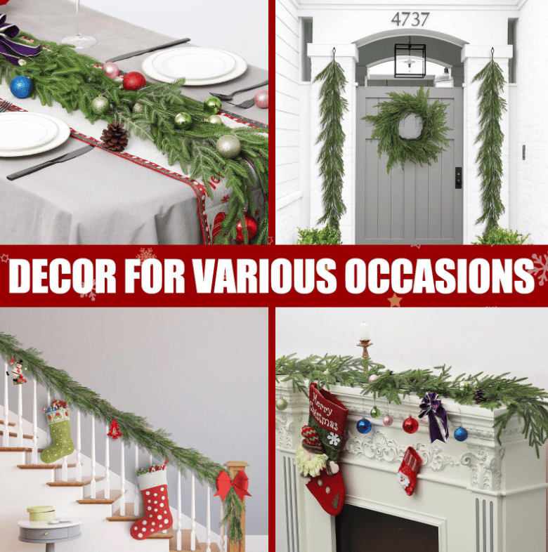 【Unique Christmas Ornaments】- Establish the atmosphere a festive celebration with our artificial Christmas Garland for mantle, creating a warm and welcoming area in your home: Mantle, Table, Stairs, Wall, Fireplace or hanging as a garland from your front door and more DIY options